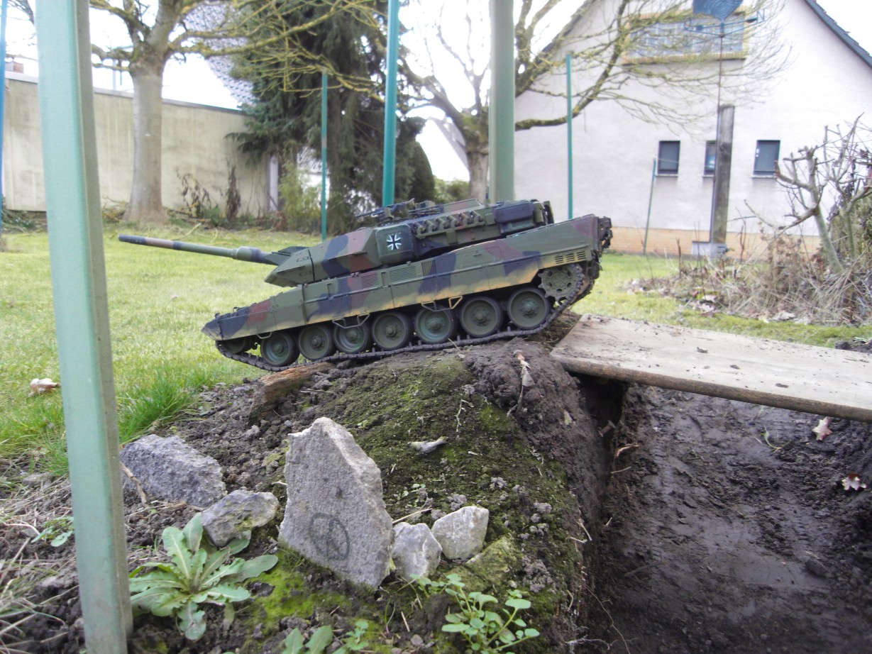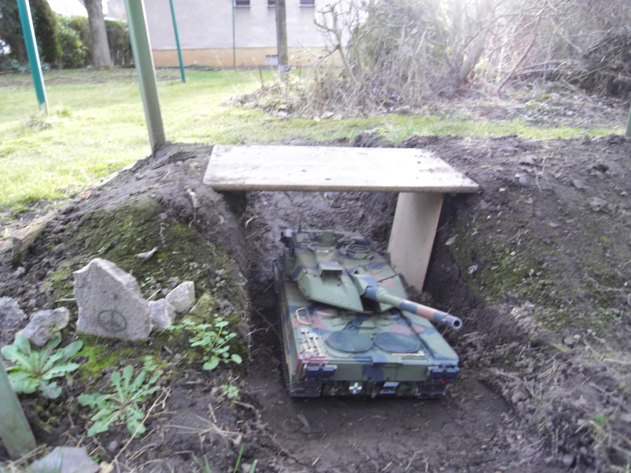 Da ich hinterm Haus einen Garten habe, kann ich da mit meinem neuen Panzer auch ein bisschen die Nachbarn nerven ;-) . So einige kleine Elemente einer Panzer-Landschaft sind inzwischen auch schon entstanden. Mal sehen, ob ich da noch weitere Ideen habe bzw. Inspirationen bekomme. Den ganzen Garten "verschandeln" möchte ich allerdings bis jetzt noch nicht ;-)