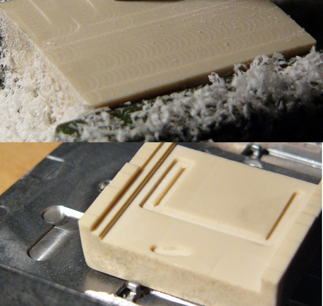 Hier noch ein Bild von ersten Fräsversuchen in Resin und Alu. Im Oberen Teil ist zum Vergleich nochmal das Ergebnis der Proxxon-Kombi aus TK70 mit Bohrständer. Die beiden ungleichmäßigen Kanten rechts und links auf dem unteren Teil stammen noch von der Proxxon.