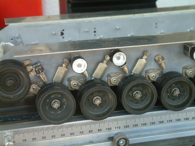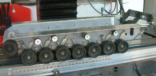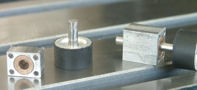 Da mir die Lagerung der Stützrollen überhaupt nicht gefallen hat, habe ich mir "Blöcke" aus Alu zurechtgeschnitten und diese mit Bronzebuchsen versehen. Die Wellen sind aus Silberstahl.