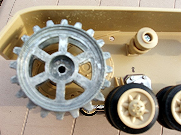 Um ein erstes Bild von der Optik zu bekommen habe ich die org. Kunststoffteile wie Kette, Lauf- und Stützrollen, sowie Spann- und Antriebsrad eingebaut. Das Bandai Getriebe ist den Namen nicht wert.