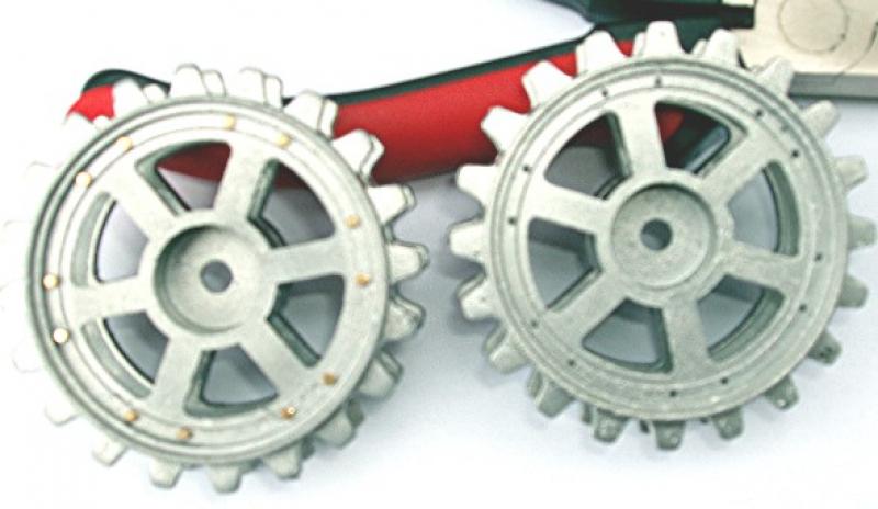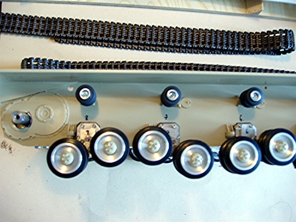 Es wird von uns einen kompletten Laufrollensatz(Alu) mit Kugellagern geben, der ohne die Plastikkappen auskommt, das komplette Mittelteil wird ein Resinteil welches eingesetzt wird.