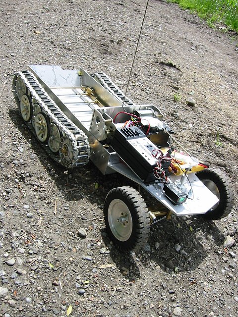 In Ermangelung einer Fräse habe ich mich mit RC-Car Kunstoff-Felgen beholfen. Als Gummireifen kommen Gummidichtungen zum Einsatz. Die Kettenglieder sind selbstgegossen (mit eingegossenen Messingbuchsen) und mit Gummipolstern beklebt. Die Zähne für den Antriebszahnkranz sind auf den Alu-Grundkörper verschraubt.