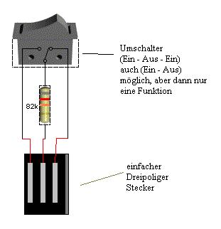 Daher hier mal ein kleiner "Schaltplan" (den auch nicht Techniker verstehen sollten), wie man sich so einen Schalter für die Futaba F-14 selber machen kann. Da ich nur zwei F 14 habe, kann ich nicht sagen, ob das auch bei anderen Geräten so einfach ist (bestimmt, nur wird der Widerstand ein anderer sein), daher bitte vorsicht.