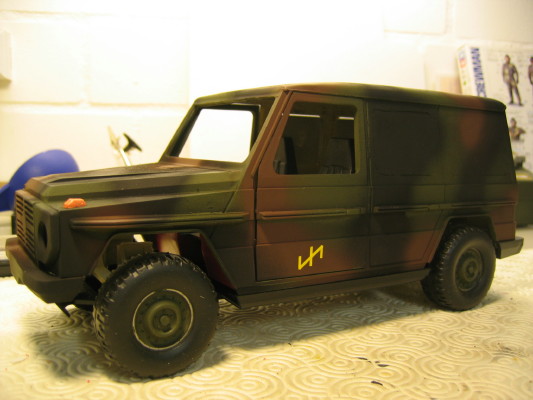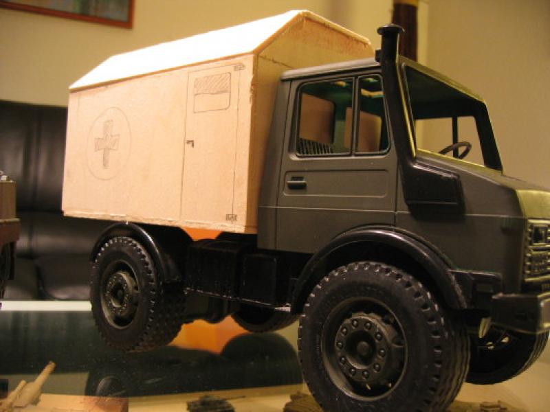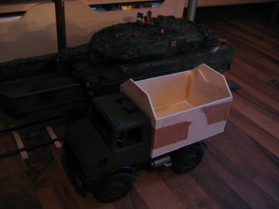 hi norbert, ist nichts weltbewegendes und hat nichts mit dem aufwand zu tun den du treibst. hatte noch einen bruder mog mit pritsche im regal. der war jedoch viel zu hoch. habe also die großen stollenräder gegen die normalen bruder lkw - reifen getauscht und ihn noch ca 1,5 cm tiefergelegt. jetzt ist er nicht mehr ganz so hochbeinig. danach die pritsche runter und aus sperrholz einen sanikoffer geleimt. soll nur ein standmodell sein und auf dem gelände neben den zelten und dem sani-wolf stehen. gruß kai
