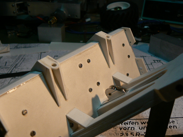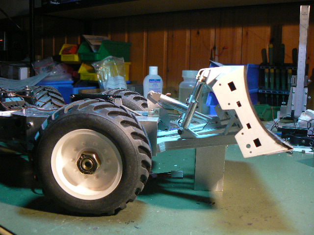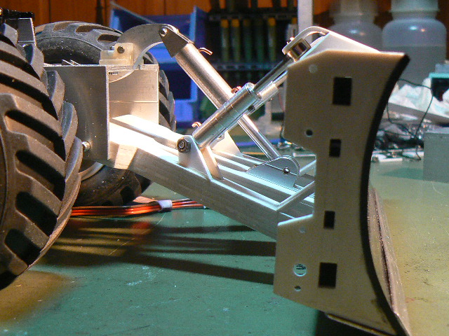 ...es ging mit der Anlenkung ds Räumschildes weiter. Entgegen dem hydraulischen Antrieb des Originals wird hier ein 7kg-Servo verwendet. Der Hub beträgt ca. 30° . Um die Optik des Vorderwagens nicht zu versauen wird das Servo weiter hinten auaf dem Rahmen positioniert und die Bewegung über einen Umlenkhebel auf den Hubarm übertragen.