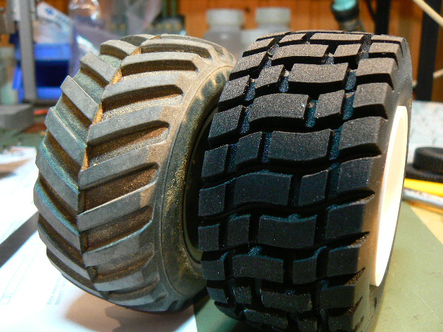 Nachdem ich nun jahrelang mit den völlig unscalen Conradschlappen rumgegurkt bin tut sich nun etwas Neues auf. Wir haben einen Reifenhersteller aufgetan der sich mit unserm Problem befasst hat. Problem deshalb weil zu diesem Zeitpunkt ausschließlich Bilder des gewünschten Gummis zur Hand waren.... und die auch noch in schlechter Qualität.
