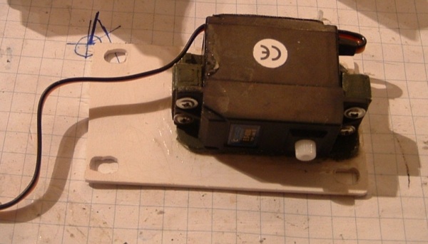 Um den Servo leicht ein-und auszubauen habe ich ihn auf eine seperate Platte geschraubt.Diese wird dann auf die eigentlich Grundplatte im Turm geschraubt.