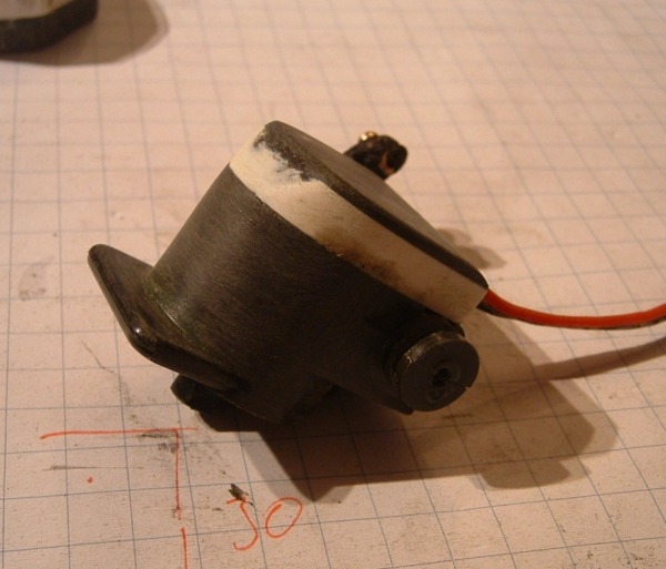 Die originale Welle wurde durch eine M2 Geweindestange ersetzt und eingeklebt.links dann,Scheibe,Servo-Horn ,Scheibe,Mutter draufgedreht,bzw geschoben und das ganze schön verklebt und nachher geschliffen.