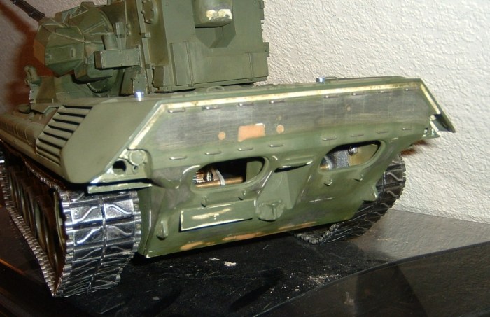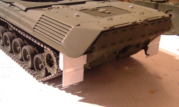 Da man doch des öfteren über eine Kante (z.B. Bordsteinkante) runter fährt, würde ich dir allerdings empfehlen, den Schmutzfänger aus Gummi zu machen. Wenn der Schutzfänger nämlich zu hart ist, setzt die ganze Wanne mit dem Schutzfänger auf und bleibt an der Kante hängen. Im Extremfall bricht sogar der untere Teil des Schmutzfängers ab. Wenn du nicht den ganzen Schmutzfänger aus Gummi machen möchtest, dann mach wenigstens den dünnen Bereich zwischen dem oberen und unteren Teil des Schutzfängers aus Gummi. Dann kann das untere Teil nach oben klappen, falls es mal Bodenkontakt bekommen sollte.