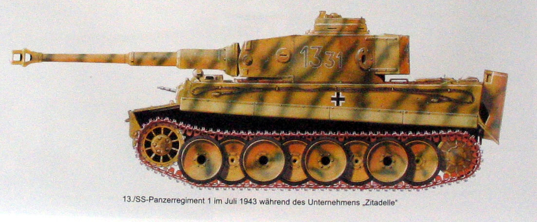 ich habe von Kai zwei tolle Bücher über " Tiger im Kampf" bekommen. Dort sind auch Zeichnungen mit den jeweiligen Farbgebungen enthalten. Nun ist das Thema Farbe gelöst: 1943 = Grundfarbe dunkelgelb, Tarnmuster Braun und Grün.