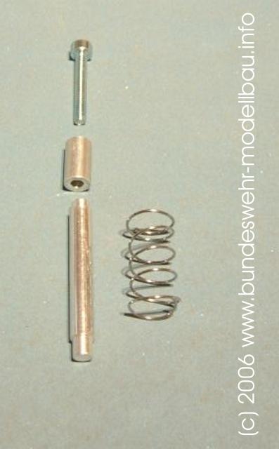 Hier die Einzelteile der Frontfederung. Bestehend aus Imbussschraube, Alu Distanzhülse, Alustift und der Feder. Die Aluteile wurden auf der Drehbank hergestellt, die Federn sind auch selber gewickelt.