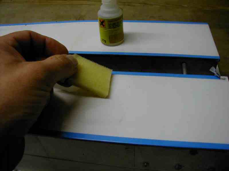 2. Oberfläche mit einem Schaumstoffstreifen, dünn und gleichmäßig, Sekundenkleber aufbringen.