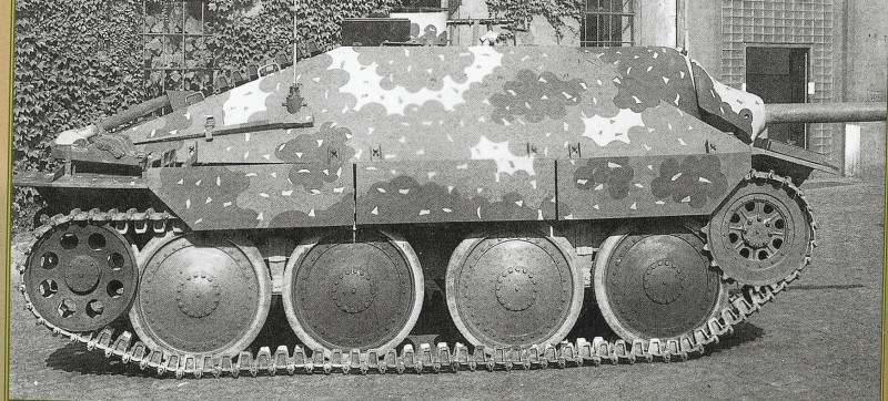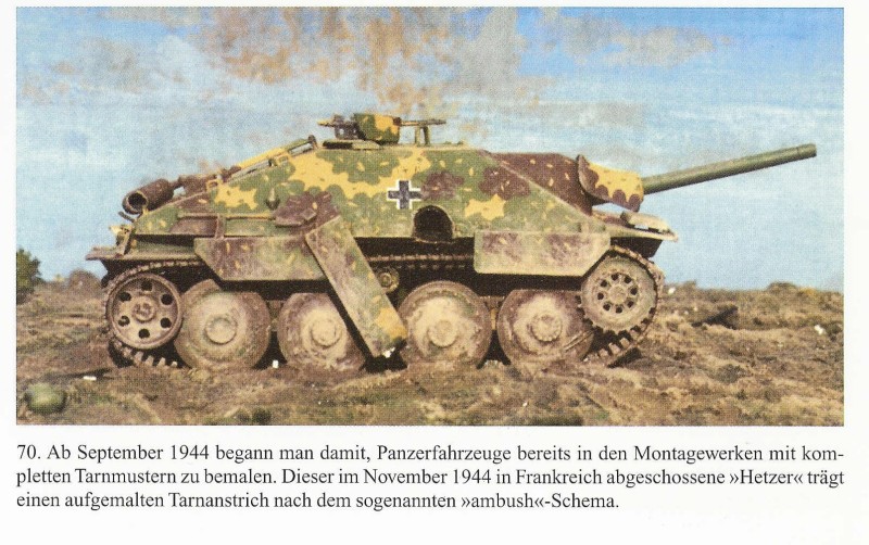 Das Tarnschema war nicht so selten. Laut Johannes Denecke ist das die ursprüngliche Version des Tarnmusters 1, wie sie vom Waffenamt für alle Panzertypen vorgesehen war. Wegen der größeren Tarnwirkung sollten die Tarnflecken aufgemalt und nicht aufgesprüht werden. Da dieses Verfahren jedoch zu unrationell war, entschloß man sich dazu, die Farben in möglichst scharfabgrenzenden Flecken aufzusprühen (siehe KöTi). Diese Version findet man aber dennoch sehr zahlreich an in der Tschechoslowakei hergestellten Panzer vom Typ Hetzer.