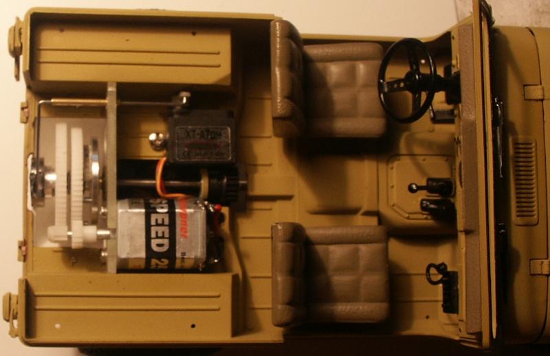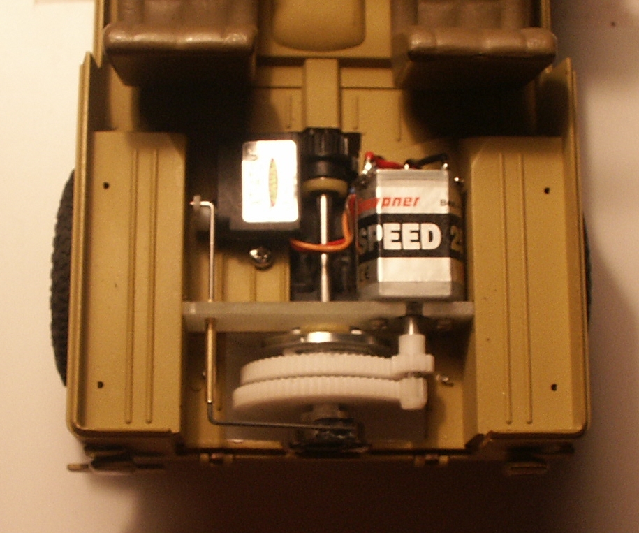 So hat mein Jeep 1:16 einen absolut kurzen Gang für schweres Gelände und schaltet automatisch hoch, wenn er schnell genug wird. Der Schaltpunkt ist über die Rückhaltefeder der Kupplungsbacke einstellbar. Über das Servo aktiviert sich bei Bedarf der Rückwärtsgang, der bei solchen Überholgetrieben normalerweise nicht vorhanden ist. Man kann über die, durch das Servo bewegte Klauenkupplung auch den ersten Gang permanent schalten. Ich hoffe ihr könnt es auf den Videos erkennen. Man hört nur einen kleinen Schlag, wenn es in den zweiten Gang schaltet.