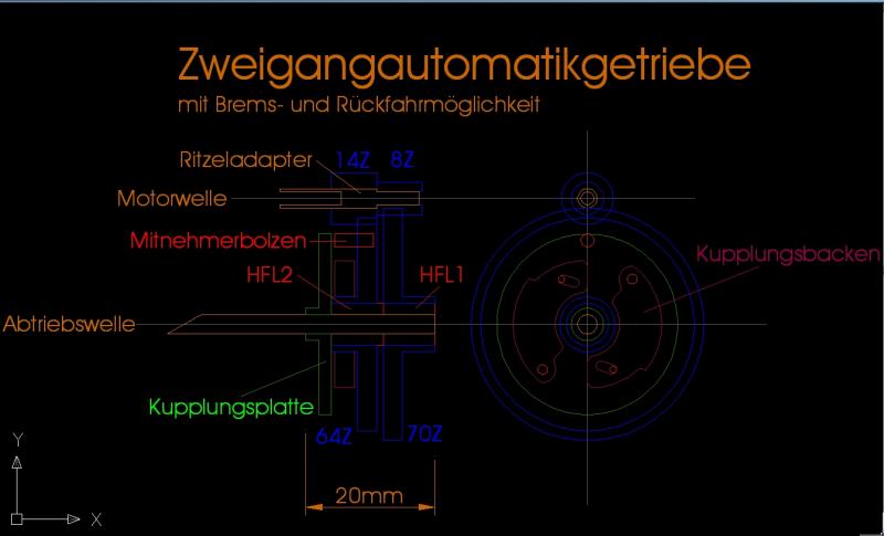 Hallo Hartmut anbei sende ich nochmal die Prinzipdarstellung für das Getriebe. Mein erster Post wurde leider durch die Serversäuberungen von 1+1 vernichtet. HFL2 wurde jedoch ersetzt durch zwei Kugellager. Die Brems und Rückfahrmöglichkeit habe ich durch die servobewegte Klaue realisiert. Diese greift permanent in das Zahnrad des ersten Ganges und kann axial so verschoben werden, dass ein Quersplint sich in einen Schlitz in der Abtriebswelle legt und somit eine feste Verbindung für den ersten Gang schafft.