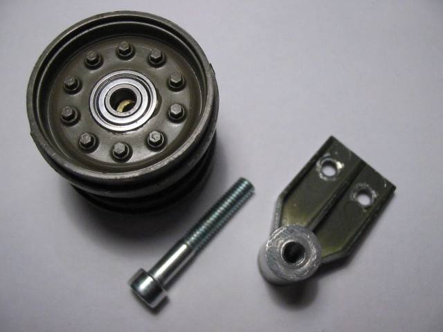 Als nächster Schritt wurde ein M5 Gewinde in den Lagerbock eingebracht. Ebenfalls erhielt die Spannrolle noch eine Distanzhülse im Inneren. Mit der Schraube werden dann beim Zusammenbau die beiden Lager gegen die Hülse gespannt. Damit ist sichergestellt, daß beim Zusammenbau nicht die Rolle bzw. die Lagersitzte in den Rollen beschädigt werden. Die Blende an der Sichtseite kann einfach mit doppelseitigem Klebeband auf die Rolle aufkeklebt werden. Zur Sicherheit habe ich noch die Achsschraube mit Schraubensicherung gegen lösen gesichert.