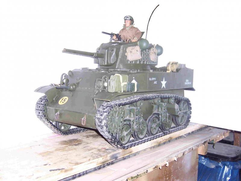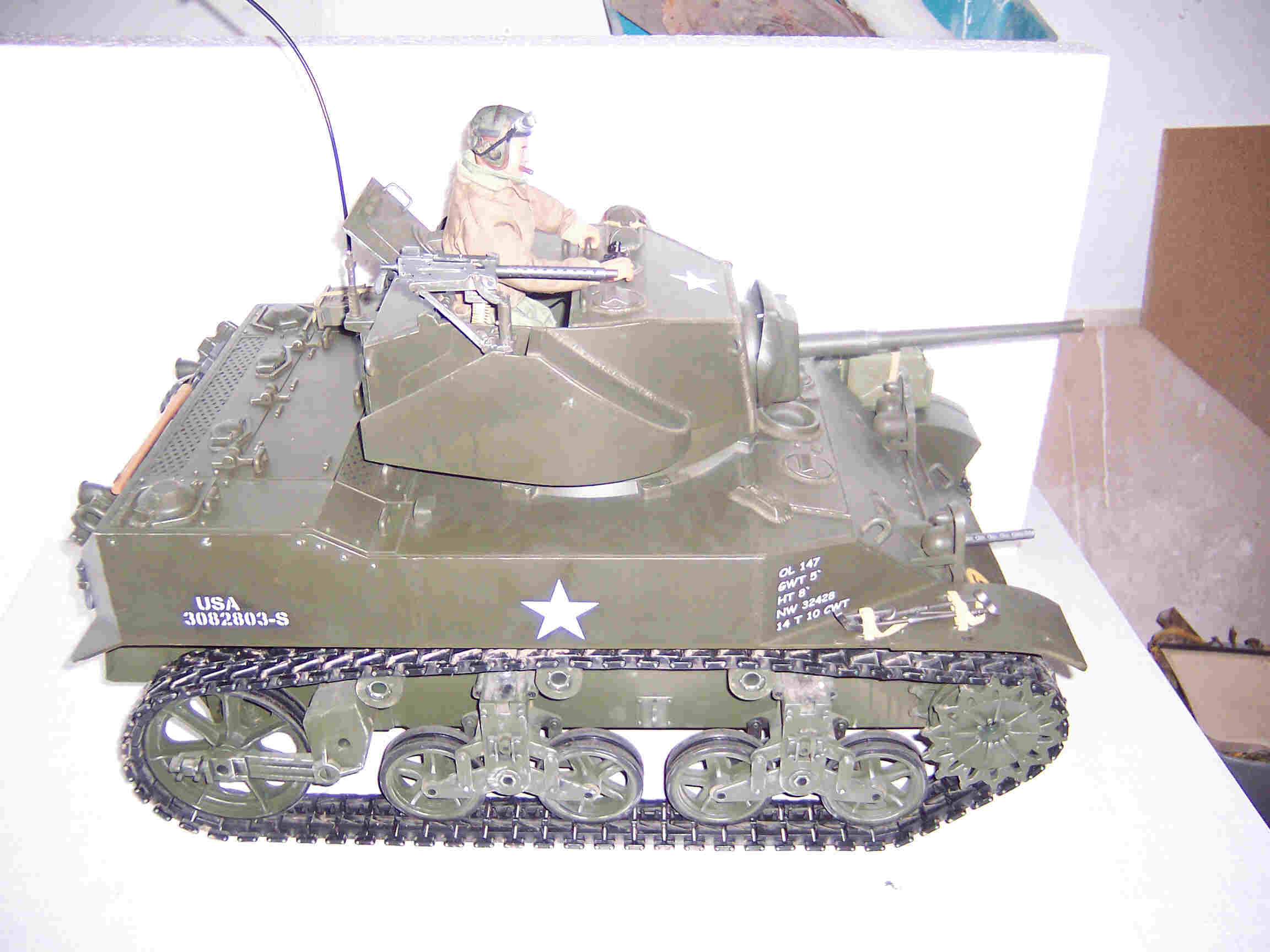 ich hab mich in den letzten Wochen einmal um meinen 1/6 er Stuart von 21 st Century gekümmert. Als erstes hab ich die Kanone mit einem Gelenk versehen, damit sie nun mittels Servo gehoben und gesenkt werden kann. Weiters hab ich die gesamte Elektronik rausgenommen und durch eine von Herrn Markus Boehm umgebaute DMD und MF ersetzt. Die umgebauten Tamiya-Komponenten vertragen jetzt 12 V und 20 A pro Motor. Super Sache! Durch Komplettierung der Komponenten hab ich jetzt einen FO Stuart! Anbauteile aus AXEL`s Shop haben die ganze Sache dann abgerundet. Aber seht selbst: