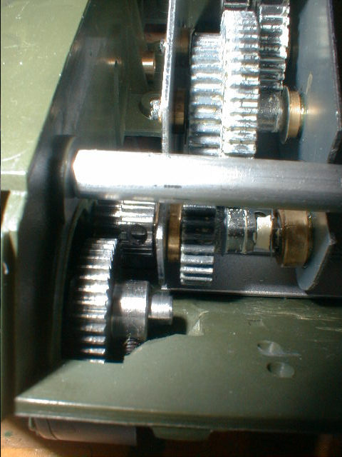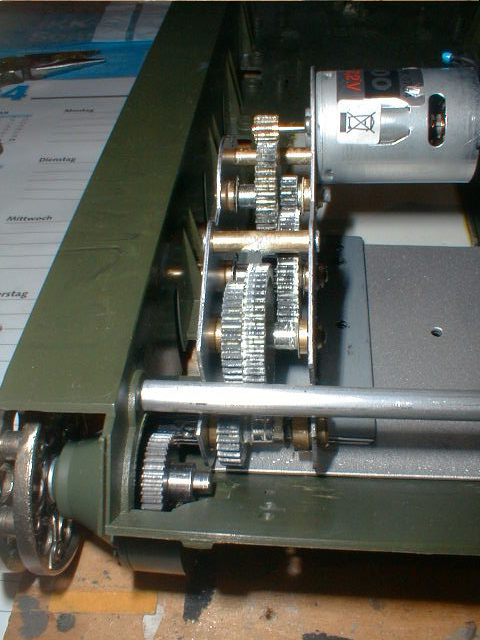 Hab heut meinen umgebauten WSN T-34 mal ein wenig durch Gelände gejagt,dabei ist mir leider nach ca.10 min auch das zweite Vorgelege kaputt gegangen.Es handelt sich um das letzte Zahnrad was auf der Antriebswelle zum Antriebsrad aufgeflanscht ist und leider aus Kunstoff besteht.Das Fahrzeug besitzt nicht mehr die Originalgetriebe sondern läuft mit 2 Tamiya Sherman Getrieben mit 2 Robbe Rookie Reglern.Diese laufen problemlos und geben dem Panzer mehr als ausreichend Kraft,wenn nur dieses letzte Kunstfoffzahnrad nicht wäre!Die Kunstoffkette und das Fahrwerk machen bis jetzt auch keine Probleme und ergeben ein recht ordentliches Fahrbild.Die Laufrollen sind auf Stahlachsen mit Kugellagern befestigt,die Schwingarme verstärkt.