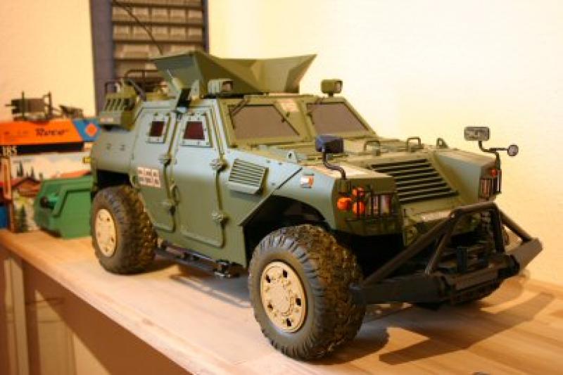 Einen langsameren Motor mit kleinerem Ritzel reingebaut, die Batteriekästen rausgeschmissen, einen 7,2 V - 3800 mAH NiMH Akku reingesetzt, die Räder abgebaut, grössere Eitech - Reifen montiert, die Karrosserie ein wenig Trockenbemalt und zwei Schichten Humbrol Klarlack-Matt aufgebracht.