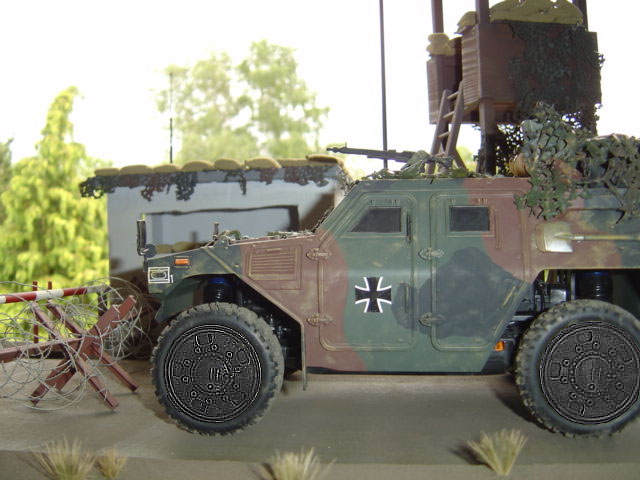 Habe nun die Kotflügel etwas verbreitert, ein Stahlseil auf die Motorhaube, Dachgepäck, die drei Antennen schraubbar - abnehmbar, MP-Stahlhelme,angebracht: