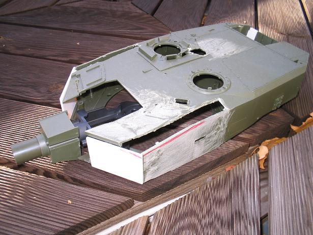 Bin etwas weitergekommen. Dank eurer Hilfe ging es etwas einfacher. Als Fixpunkte hab ich einiges vom Tamiya Turm stehengelassen, was später auch noch abkommt. Zum Beispiel vorn die Schrägen und den E- Messer? (Bin nicht sicher,ob es der E- Messer ist). Die Position Mitte Rohr wird denk ich auch unverändert zum 2A6 sein. Also erstmal wie Tami ohne kleben zusamensetzen, dann entsprechende Blende neu baun. Die ist ja relativ einfach (quadratisch, praktisch, gut). Details werden hier interessant, zum Beispiel die "Abdichtung" der Blende zum Turm mit "Plane" ähnlich Leo1. Hinten hab ich die "Ruine" schon wieder geschlossen.