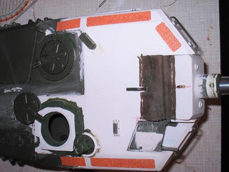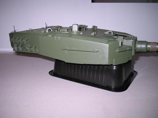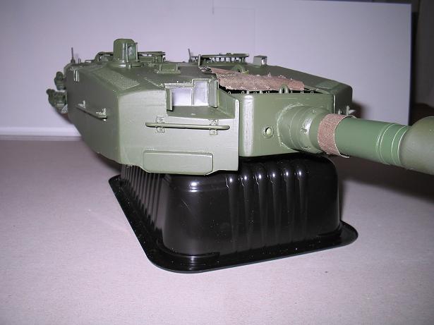 Nach längerem Sinnieren, womit ich die Abdeckung der Kanonenblende machen sollte, hatte ich heut eine Idee! In die Garage und Material abgeschnitten. Wovon? Naaa? Ich finds geeignet. Beim Leo1 sieht die Abdeckung eher nach Stoff aus, beim Leo2 nach "Plaste". Das war das Problem. Noch etwas Nacharbeit und es ist ok. Jetzt fehlen nur noch Kleinigkeiten. Dann gehts ans lackieren.
