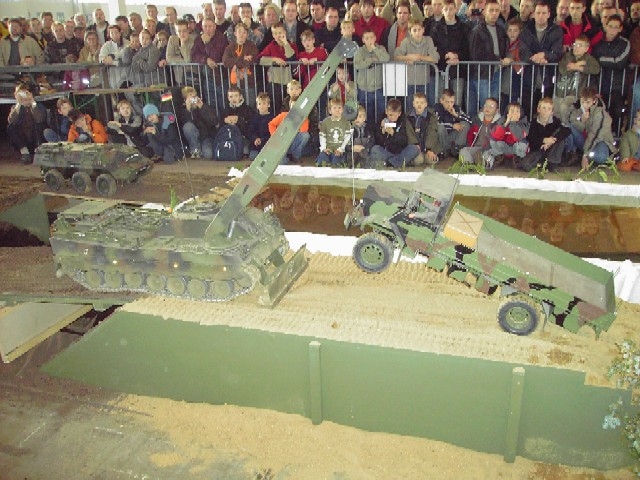 Die Fahrzeiten auf den Messen können wir uns nicht frei aussuchen, da in der gleichen Messehalle immer auch andere Modellbauclubs mit ihren Modellen fahren wollen. Daher werden die Fahrzeiten je nach Anzahl der Clubs vor jeder Messe neu festgelegt und außerhalb der Fahrzeiten sind dann auf dem gesamten Messestand der RK ALLE Fernsteuerungen aus. Wenn du mal erlebt hast, wie ein 80kg schwerer Bergepanzer mit seinem Räumschild wegen einer Stöhrung mit Vollgas auf die Zuschauer zurast, dann kannst du sicherlich auch nachvollziehen warum eine solche Frequenzaufteilung und Funkdisziplin auf Messen sein MUß !!!