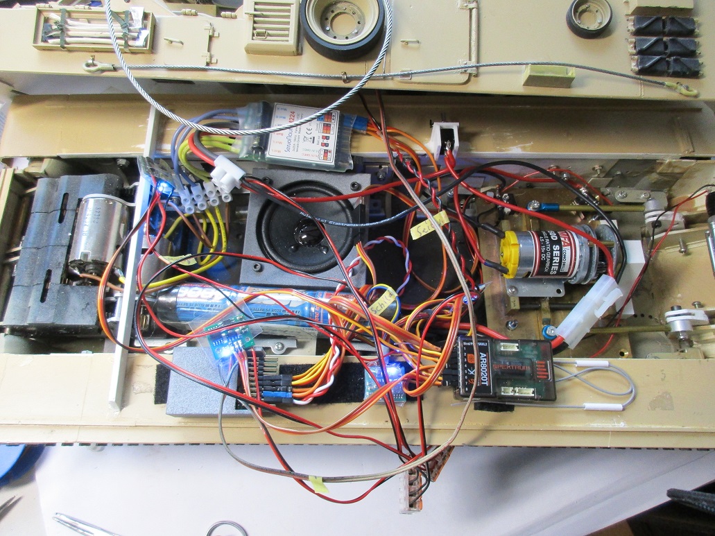 Wie beschrieben habe ich den M88 restauriert. Umstellung auf 2,4Ghz. Regler von Servonaut M224 da die Regler sehr feinfühlig arbeiten und der 224 die Möglichkeit bietet ein "Fremd" Soundmodul anzuschliessen. Dieses kommt von Benedini. An Funktionen hab ich jetzt die "Crawler" Winde neu, die auch sehr gut arbeitet und auch in 1/16 gut passt. Dazu ja das aufrichten des Kranmastes und Seilwinde Kran. Ausserdem der Antrieb des Räum/Stützschildes mit der bewährten AFV Technik. Die erforderlichen Regler sind von Firma "modellbauregler". Jetzt suche ich noch eine "schöne" RKL, das Pistenking Ding hab ich rausgeschmissen. Dazu eine Kranflasche für den Kranbetrieb als Flaschenzug.