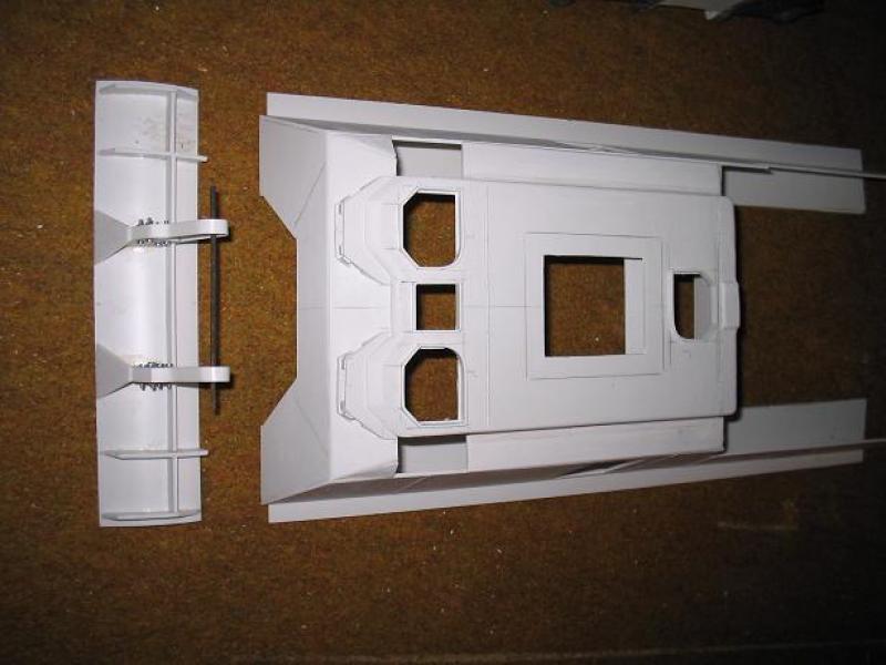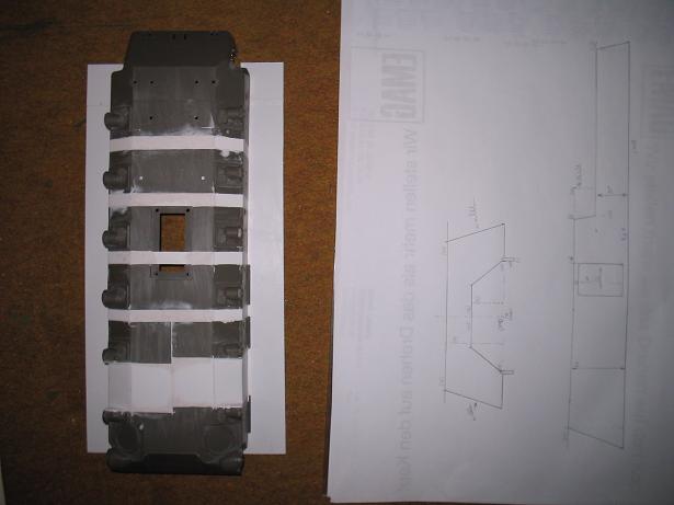 Leider fehlt mir im Moment Material....Gußeisen für den Aufbau...nein, 2mm Plastikplatten. War nicht in der Stadt. Aber die Abdeckungen der Ketten hab ich geschnitten, so kann man schon mal die Abmaße des Werkes sehen und natürlich die Wanne verschliffen.
