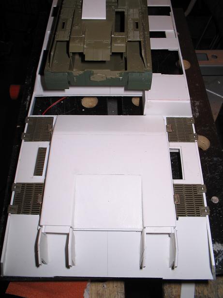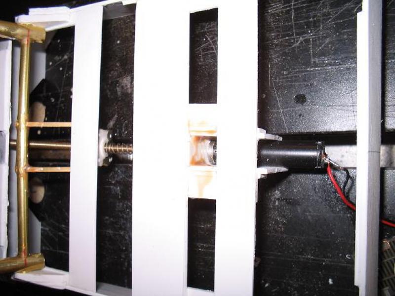 Nach unendlich vielem Probieren (trotz viel Papiergemache) hab ich den Spindelantrieb für das aufrichten des Baumes eingeklebt. Der Weg nach vorn (Neigung) befriedigt mich noch nicht. Aber es ist vertretbar. Auch am Heck hab ich weitergerbeitet.