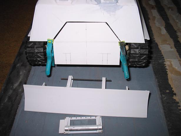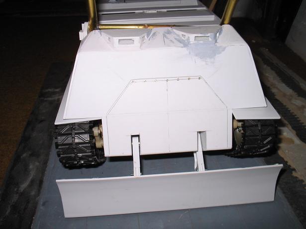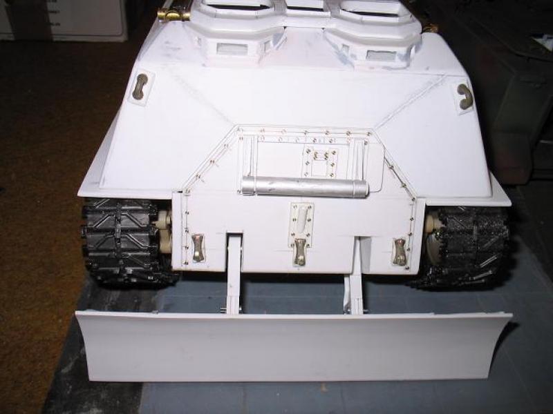 Abwechslung muß sein- deshalb hab ich mal vorn weitergemacht. Die bei BPz übliche, spannende Suche nach der relistischen Anlenkung des Räumschildes. Allerdings ist dies mit einem 1:35er Vorbild einfacher als bei meinem Büffel.