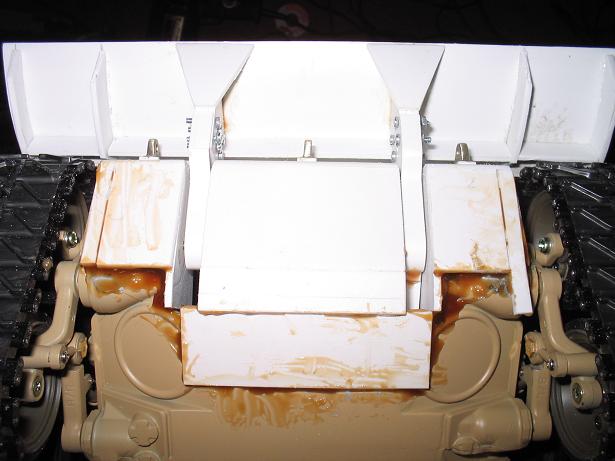 Hier mal die Anbindung der komplett neuen Front von unten. Nicht schön, aber später unsichtbar. Die Kontur der "Pershing" Wanne lies leider kein genaues, gerades sägen zu. Eher was für grobmotoriker. Aber Farbe verdeckt ja vieles....