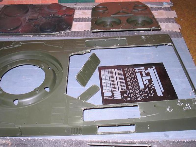 Motorraumabdeckung ist ausgeschnitten, ebenso die Klappen. Zum einen um später an die DMD und Akku heranzukommen, die wie geschrieben, aus dem Turm in die Wanne sollen. Zum anderen um Details in den Staukästen darzustellen. Mit dem abschneiden der Werkzeughalter und des Tankschlauchs hab ich begonnen. Auf dem Foto seht ihr auch die Ätzplatine von GG. Aus den Teilen der Platine (es fehlen schon ein paar) sollen die neuen "schöneren" Wkzg.-halter entstehen, die Klappen und Scharniere werden neu aus 2mm Plastik gefertigt. Zugegeben, sieht etwas wüst aus. Aber das wird.