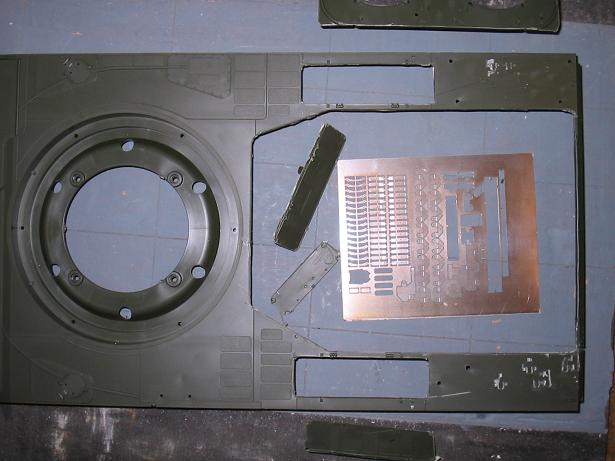 Motorraumabdeckung ist ausgeschnitten, ebenso die Klappen. Zum einen um später an die DMD und Akku heranzukommen, die wie geschrieben, aus dem Turm in die Wanne sollen. Zum anderen um Details in den Staukästen darzustellen. Mit dem abschneiden der Werkzeughalter und des Tankschlauchs hab ich begonnen. Auf dem Foto seht ihr auch die Ätzplatine von GG. Aus den Teilen der Platine (es fehlen schon ein paar) sollen die neuen "schöneren" Wkzg.-halter entstehen, die Klappen und Scharniere werden neu aus 2mm Plastik gefertigt. Zugegeben, sieht etwas wüst aus. Aber das wird.