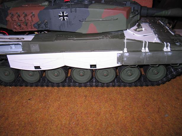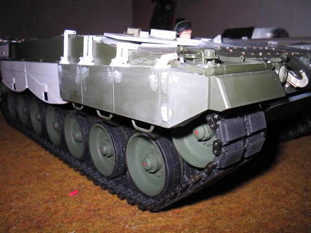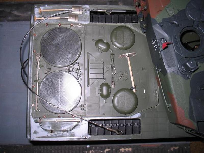 Deine Mühe und der Aufwand haben sich voll gelohnt.Ich finde deine Baukünste echt genial.Was ich gut finde ist die DMD-Einheit in der Wanne zu verbauen so hast du wesentlich mehr Platz im Turm und die Kabelei fällt auch ziemlich weg zumal du auch deinen Empfänger dort versteckt hast.Die Werkzeughalter sind eine super Sache die werde ich auch noch an meinem Leo verbauen.Hoffe ich kriege das auch so hin wie du.Eine Frage habe ich aber noch zum Turm hast du den eigendlich angemalt oder mit Airbrush gemacht?