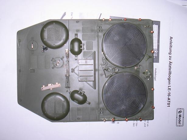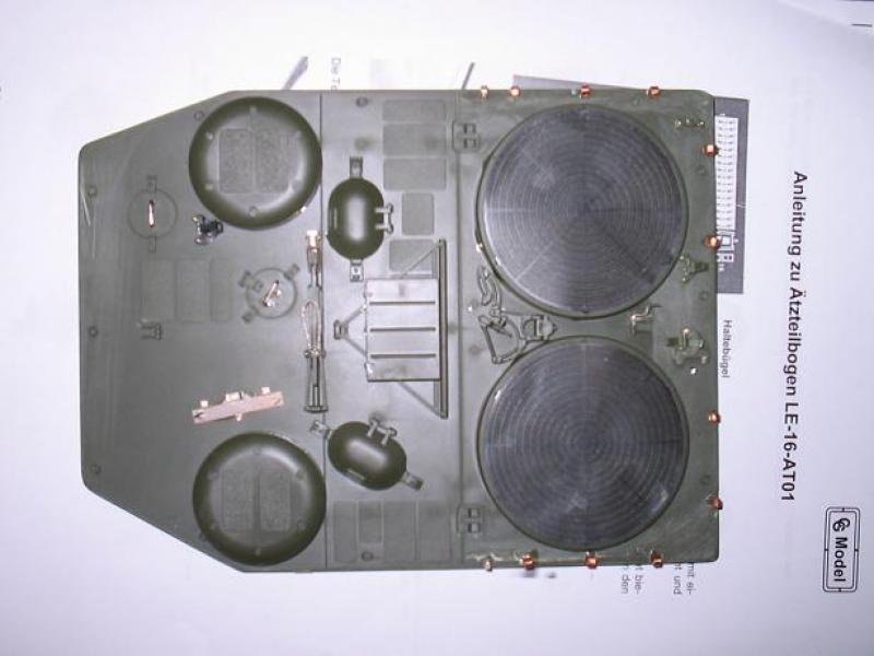 Im Moment hab ich wenig fotogene Themen. Ein Lautsprecher für meinen Leo1, Feinarbeit mit den Werkzeughaltern. Ich warte auf Niete von AFV. Die Halter mit "weichem" Draht zu baun ist nicht sinnvoll, da die Enden schwer zu "verdicken" sind. Dann rutschen die Drähte wieder raus....Aber ich möchte trotzdem ein Foto zeigen mit den "leichten" Kettenschürzen