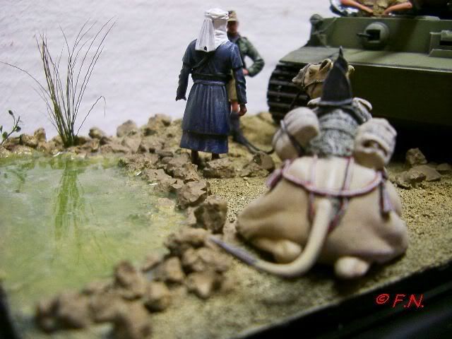 Der Untergrund entstand aus Sand und Steinen (... Dein Werk Frank...), den ich mittels Holzleim/Wasser -und Vogelsandgemisch entsprechend des Displays modellierte. Das Wasser entstand aus zwei-Komponenten-Gießharz (transparent) was mit etwas Farbe eingefärbt wurde! Die Tigerbesatzung unter der Bezeichnung "Tropical Panzercrew # 1 u. # 2 stammt von der Fa. Warriors, der Beduine und das Dromedar stamt von Verlinden.