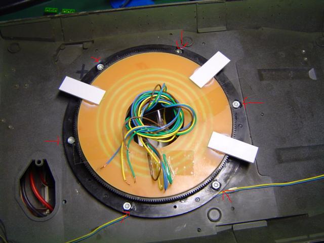 Der Obere teil des Drehkranzes passt genau unter den Gepardturm, dort wird er von unten mit dem Turmboden verschraubt, die Löcher am Drehkranz müssen Angesenkt werden sonst bleiben die Schraubenköpfe evtl. hängen.