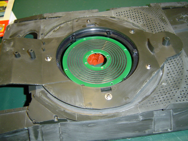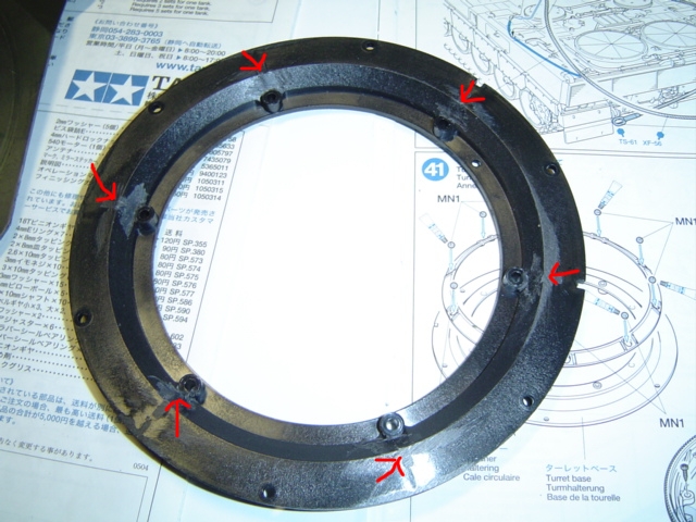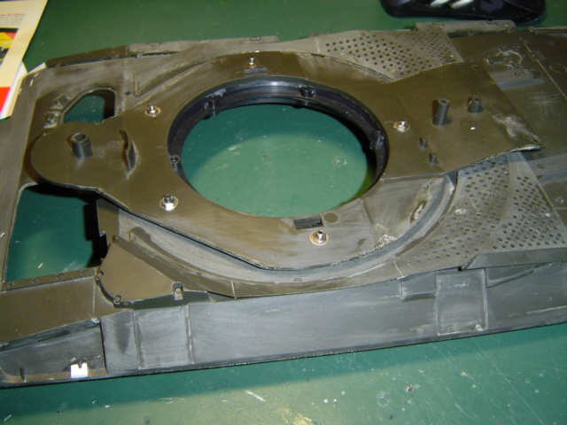 Anschließend wird der Kranz von unten an die Turmunterplatte geschraubt, verwendet werden Senkkopfschrauben, wobei die Löcher alle gesenkt wurde das die Schraubenköpfe nicht überragen.