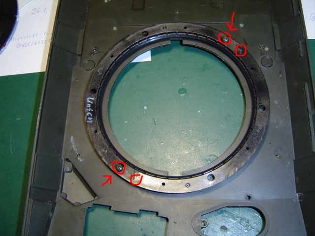 Zum zentrieren des unteren Kranzteiles an der Oberwanne kann man Ihn an den Kleinen Bolzen wo der Metallbügel angeschraubt war vorsichtig anschrauben.
