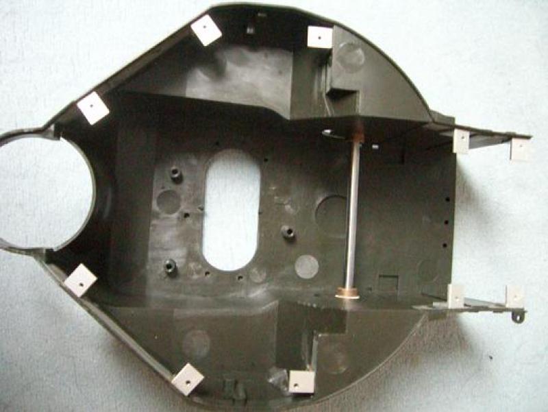 Das Turm Oberteil wird dann vorne in die Lasche geschoben, der Turm mit den Schraubenlöchern über die Fahrerluke gedreht und von unten durch die Luke verschraubt.