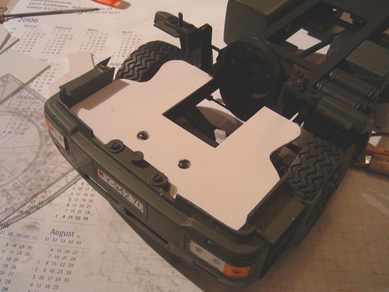 Außerdem habe ich ihm eine Art Unterbodenschutz unter die Stoßstange montiert.Sie ist aus 2mm Poly und einfach auf dem Servo aufgeklebt.Die beiden Verstärkungstreben sind aus 1mm Poly.