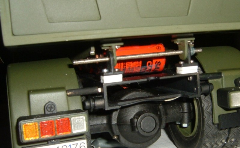 Der Akku soll laut Bauplan unter der Pritsche montiert werden.Das geht mit einer Sub-C Zelle aber nicht so ganz,da die scheibnar dicker sind als die Akkus aus der Zeit wo der Truck gebaut wurde. Somit musste ich die Pritsche etwas höher setzten.