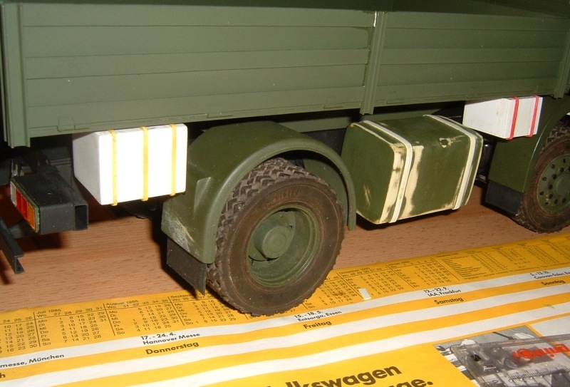 Die Staukästen sind aus 1mm Poly und die Haltestreben sind Gummiringe die mit Sekunden Kleber nachträglich fixiert worden.Dem Benzintak habe ich die beiden fehlenden Halteriemen spendiert und die Kotflügel bekamen noch kleine Schmutzfänger,beides wieder aus 0.5er Poly.