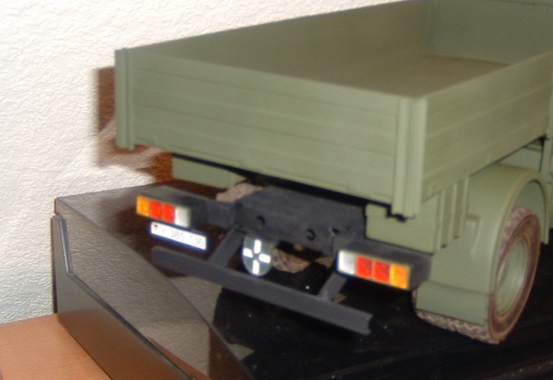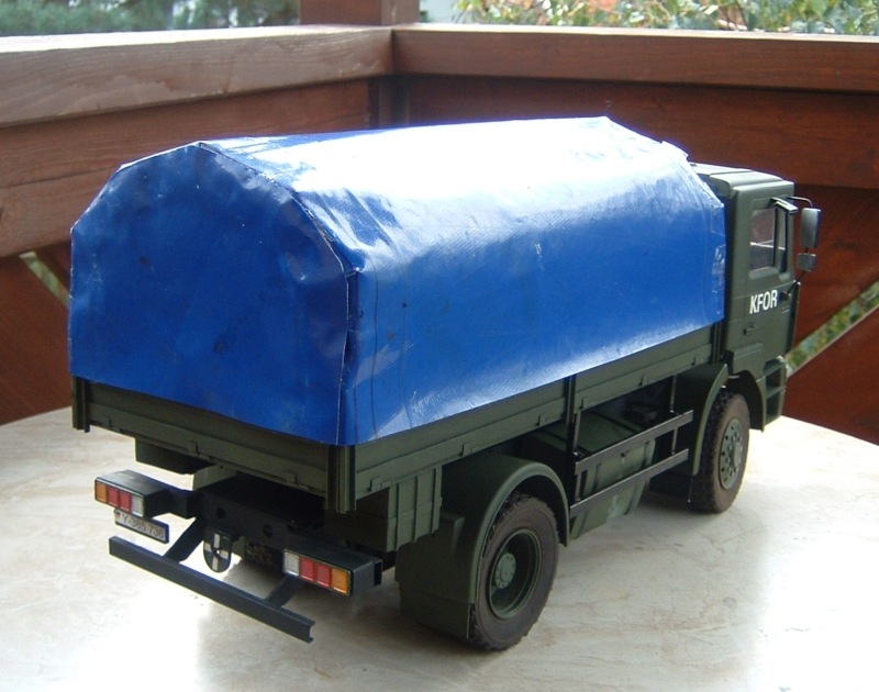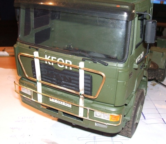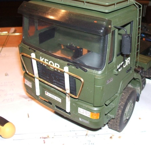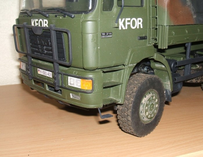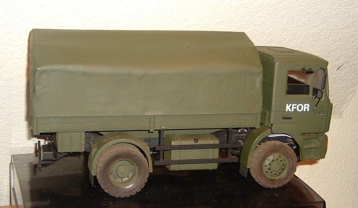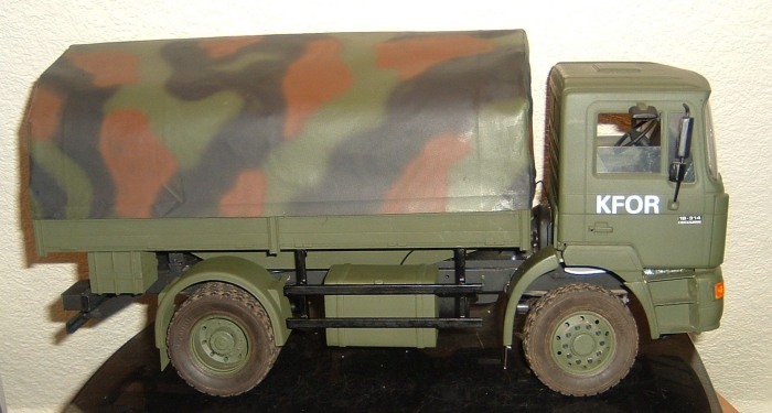 Gestern haben ich ihm estmal den KFOR-Schriftzug verpasst.Die Buchstaben sind Klebebuchstaben von Zweckreform.Leider bekam ich sie nicth in weiss,somit musste ich die Schwarzen Buchstaben erstmal mit weiss übermalen.Hat aber gut geklappt.