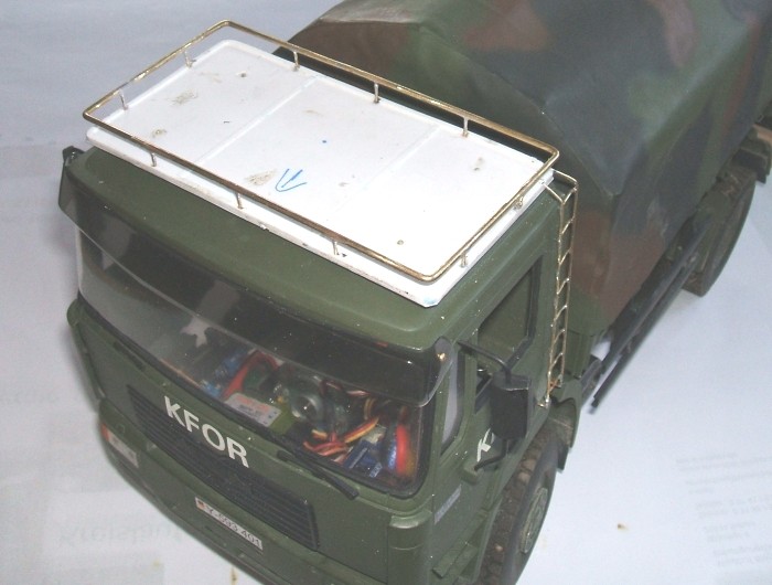 Habe dann die Kotflügel montiert und das Fahrerhaus grob angepasst.Mann war das ein Scheiss,sogar die Halter für das Fahrerhaus müssen erst noch angeklebt werden.