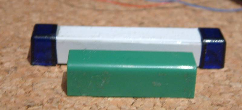 Der Lichtbalken wurden von einem Dickie Polizei Auto gemopst. Da mir der Lichtbalken zu kurz war und er zudem aus zwei Teilen bestand (1x das Blaue und 1x das Grüne Mittelteil) folgt das Mittelteil in die Restekiste, der blaue Teil wurde in der Mitte getrennt und mit Polyplatten wieder zusammengefügt.