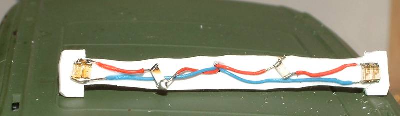 Verwendet wurden blaue SMD LEDs des Typs 1206, wovon jeweils 2 parallel geschaltet sind. Da das Gehäuse der LEDs "Klar" ist, wurden die Frontblitzer mit Revell Farbe "Transparent blau" (ich glaube Nr. 327) eingefärbt.