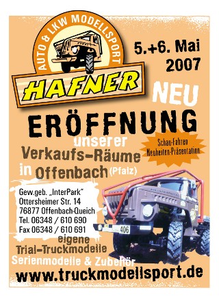 Modellbau Hafner eröffnet am 05./ 06. Mai 2007 seine neuen Geschäftsräume in Offenbach/ Queich bei Landau (genau, die dicken Kinder usw. ). Da sollten wir doch mit ein paar Leuten auftauchen (vorher anmelden) und den Landauern mal zeigen, was im Modellbau so möglich ist. Der Eine oder Andere hat ja nicht nur einen Modellpanzer sondern auch 'nen Trialtruck im Keller rumstehen.