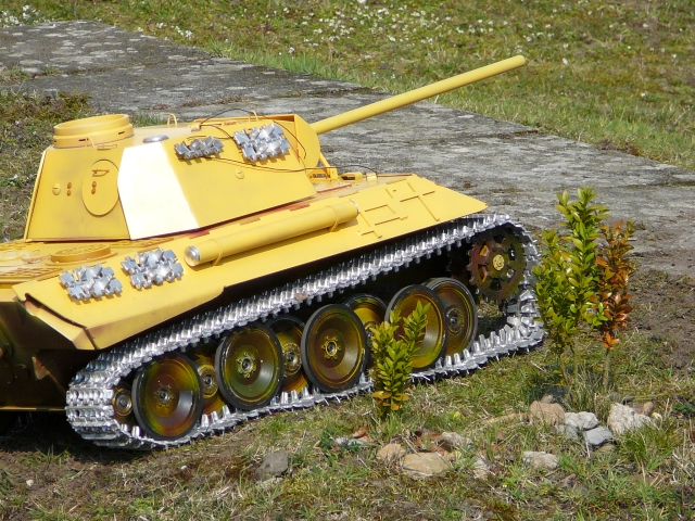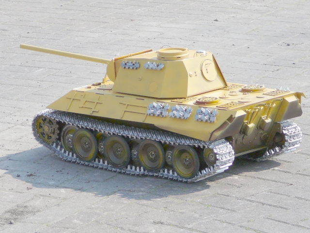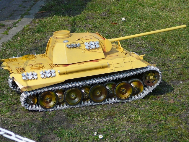 Natürlich habe ich auch den eifrigen Pantherbauer Michael alias "Dodge204" getroffen, der sich zu Hause sehr bemüht hatte, sein Stahlmodell zu diesem Termin fahrbereit zu machen. Seine Antriebslösung mit den Zahnriemen zeigte sich als zwar wenig platzsparend, aber doch erfreulich leise und in der Wirkung sehr befriedigend "lebendig". Die zwei Akkus für seine 24 Volt-Motoren machten den schon schweren Happen natürlich auch nicht gerade leichter. Der gute Fahreindruck ließ davon aber nichts erahnen. -- Gruß Hartmut